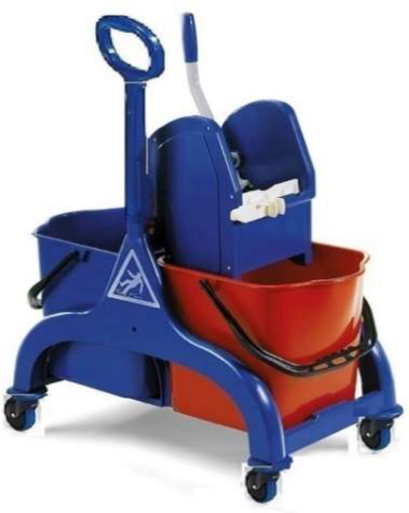 Carrello professionale antiurto con doppio secchio, ideale per sistemi di lavaggio con acqua pulita e acqua sporca separate.